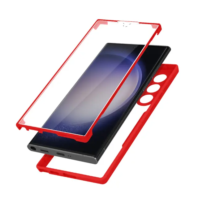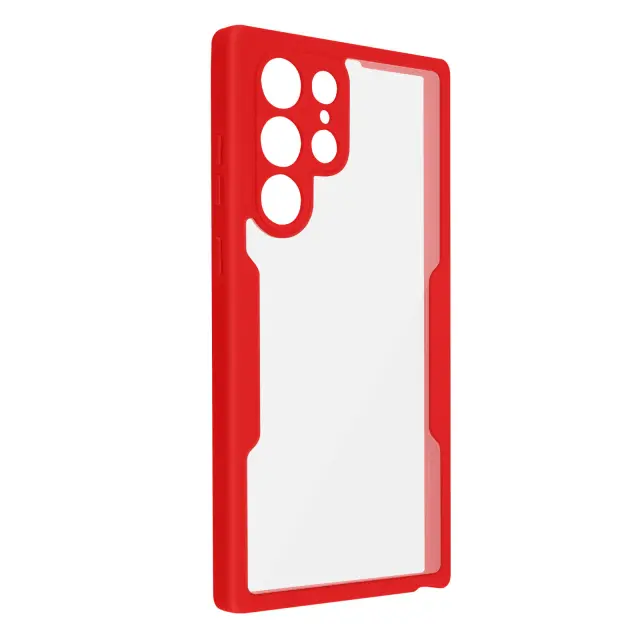 Celoten ovitek z Samsung S23 Ultra. Sestavljen iz robustnega hrbtnega dela iz pleksi stekla in sprednjega dela iz polimera. Ojacani vogali. Dostopne funkcije in lastnosti zaslona v celoti ohranjene. Preoblikovani stranski gumbi.