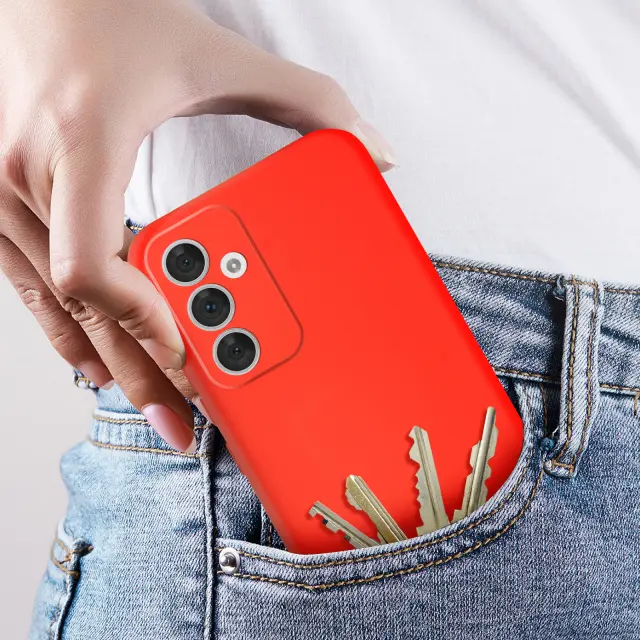 Rdeca torbica za Samsung Galaxy A34 5G, serija Fast Cover. Ta poltrdi silikonski ovitek nudi ucinkovito zašcito pred nevarnostmi. Zahvaljujoc matiranemu zakljucku preprecuje prstne odtise. Popolnoma se ujema z obliko vaše naprave.
