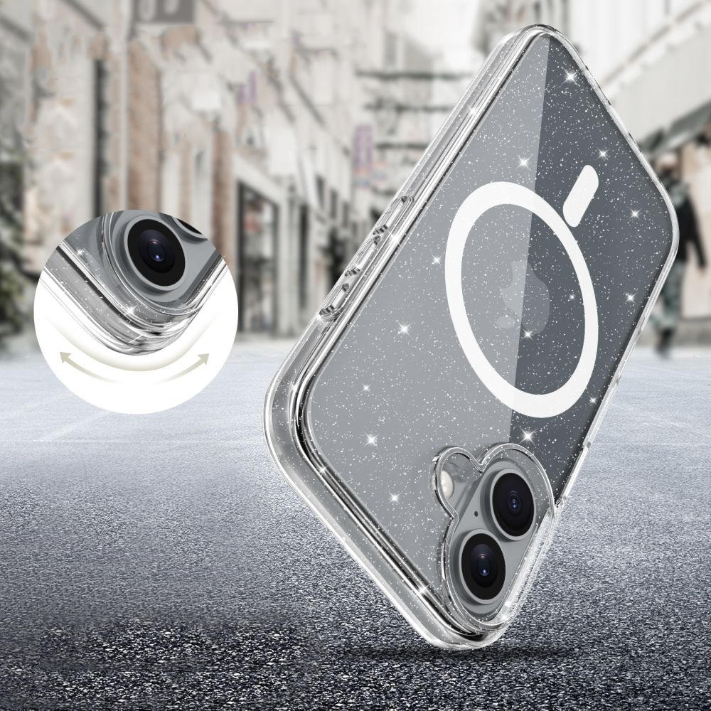 TECH-PROTECT FLEXAIR HYBRID za MagSafe je idealna rešitev za ljudi, ki cenijo tako eleganco kot funkcionalnost. Zahvaljujoč inovativni zasnovi, ovitek ne ščiti le vašega telefona pred udarci, ampak poskrbi tudi za edinstven videz vašega iPhone-a. Sijoča površina z bleščicami pritegne pozornost, upogljiv material pa se prilagodi telefonu in zagotavlja udobje vsakodnevne uporabe.