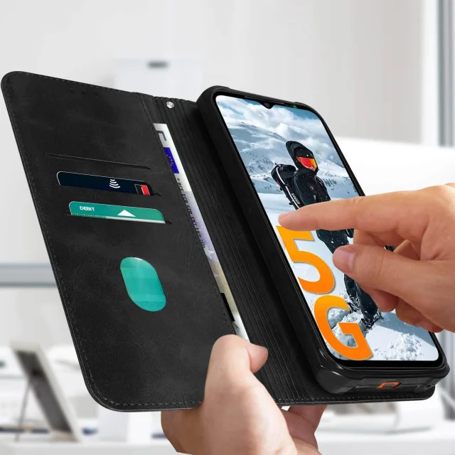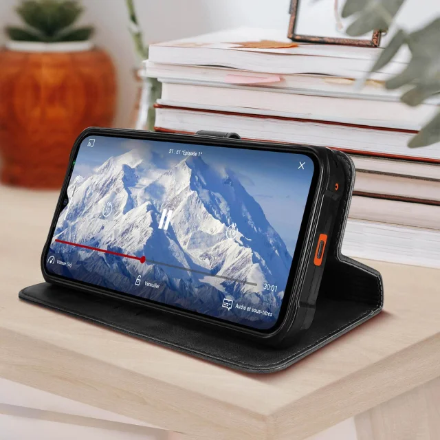 Ovitek Ulefone Armor 12 5G s preklopno denarnico in podporo za video, vgrajenim zapestnim pašckom, crna