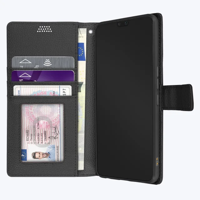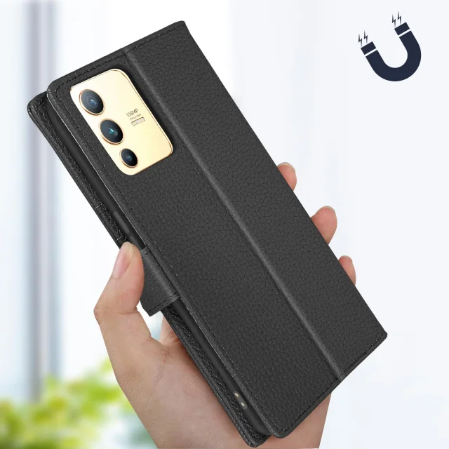 Ovitek Vivo V23 Pro z denarnico na preklop in stojalom za video, magnetnim jezickom in pašckom za zapestje - crn