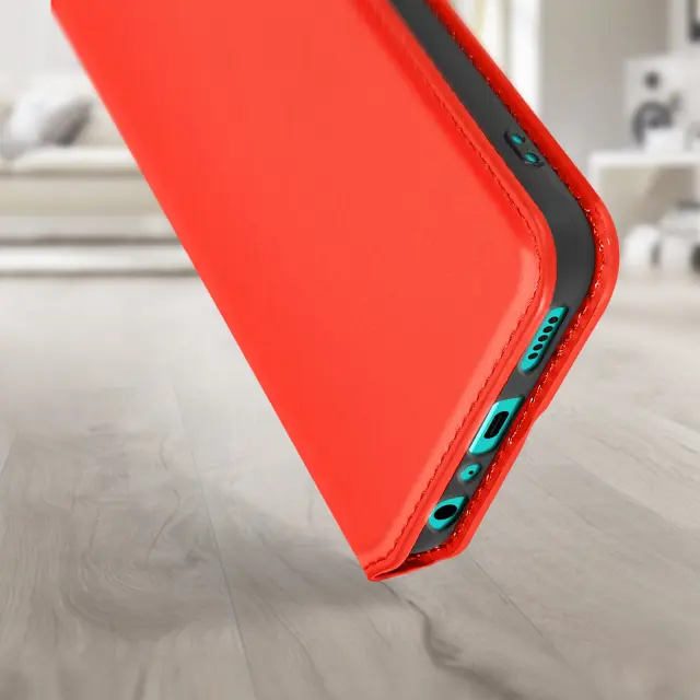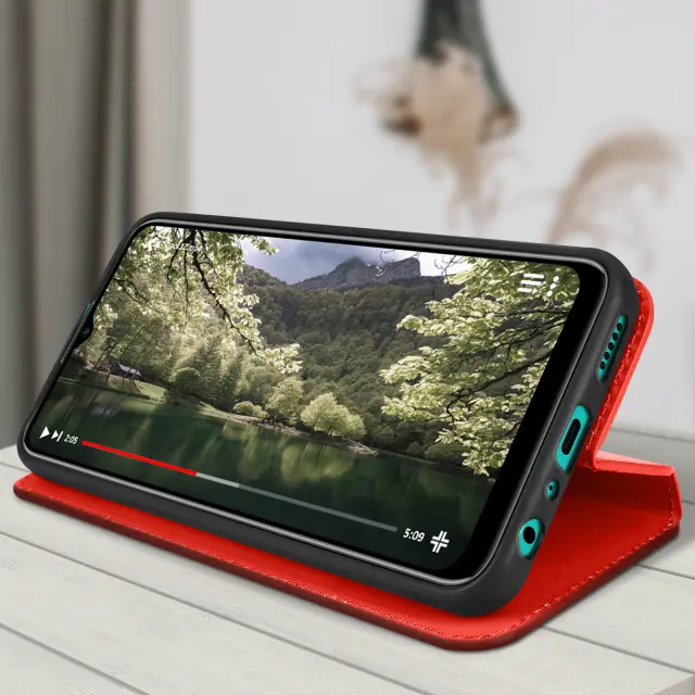 Ovitek Wiko T10 rdec. Ta Ovitek ima reže za kartice v preklopni podlogi in trdno, prožno silikonsko gelno ohišje. Deluje tudi kot vodoravna podpora za ogled vaših videoposnetkov.