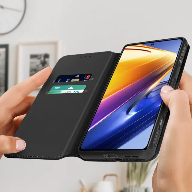 Ovitek Xiaomi Poco F4 GT z držalom za kartico in video podporo, magnetni preklop - crn