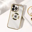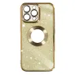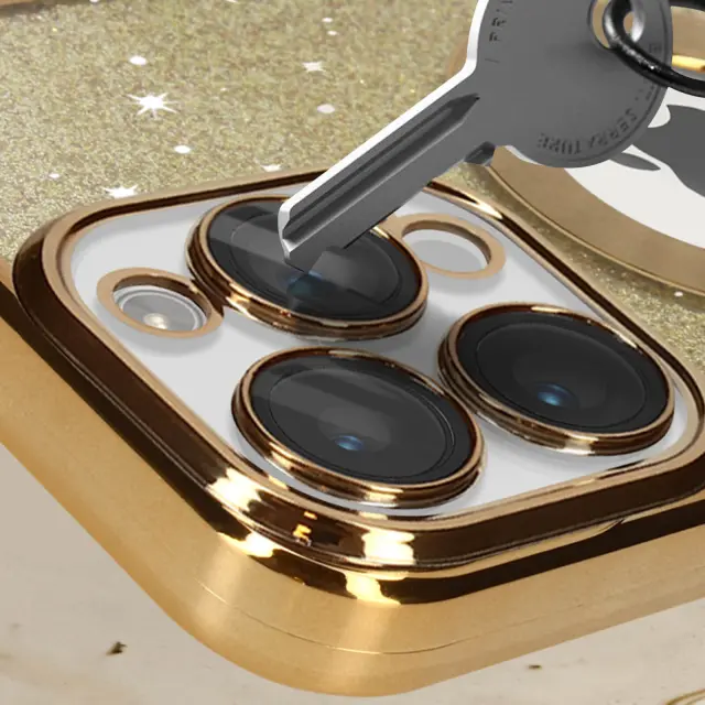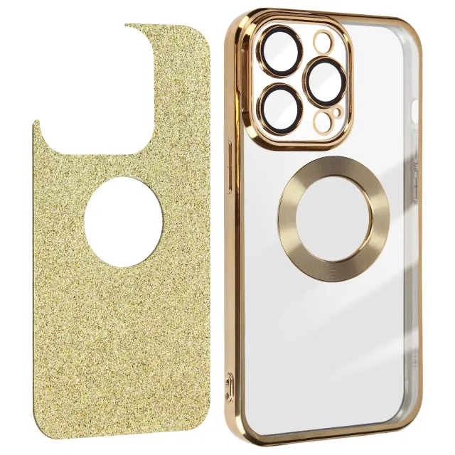 Preobrazite svoj iPhone 14 Pro s to silikonsko torbico iz zlatega gela, serija Protecam Spark. Njegova blešceca zasnova in kromiran okvir dodajata pridih sijaja. Odstranljiv list z blešcicami omogoca neskoncno prilagajanje.