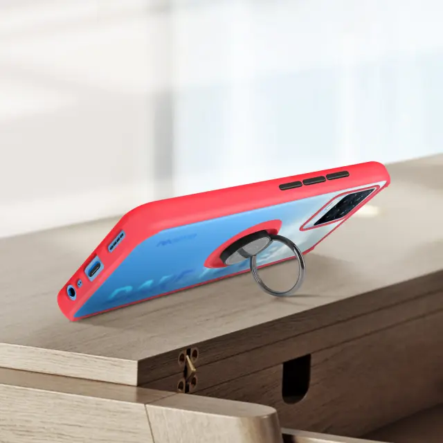 Rdeca polikarbonatna lupina Realme 8 in 8 Pro. Njegov prozoren in dimljen videz ter mat robovi dajejo moderen videz. Gumbi so odstranljivi in zamenljivi. Opremljen je z zadrževalnim obrocem, ki deluje tudi kot opora za video.