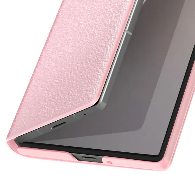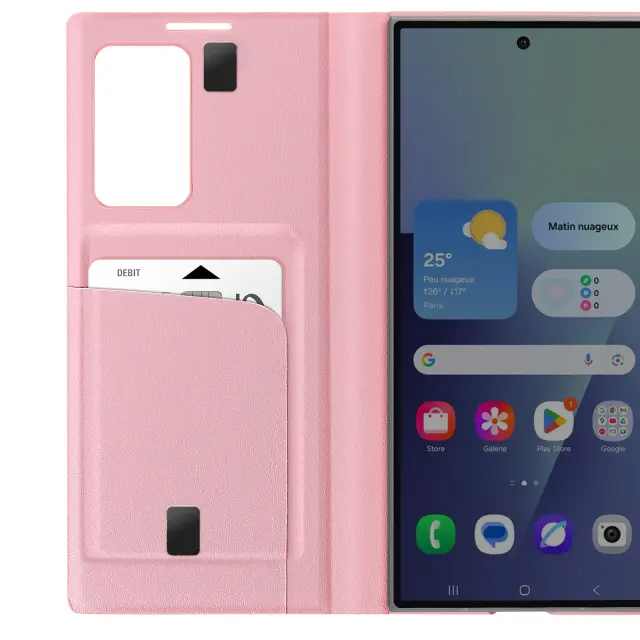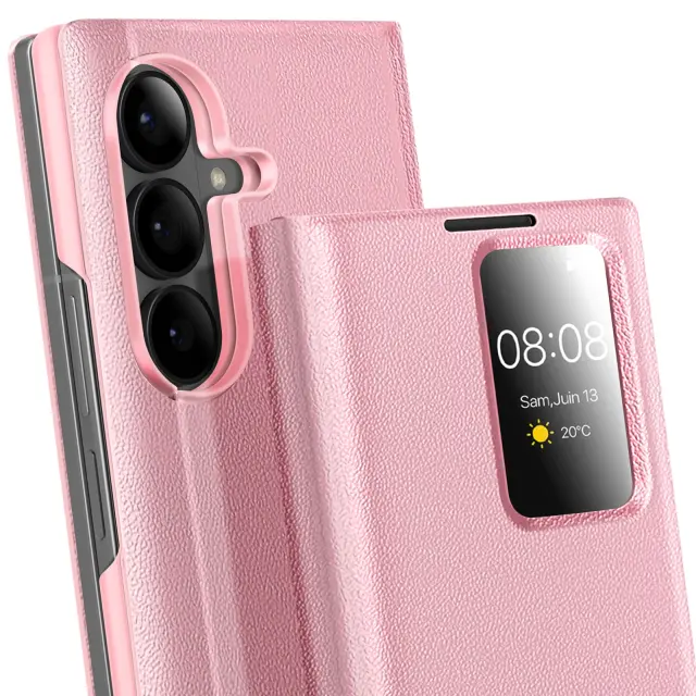 Ta roza denarnica za telefon Galaxy Z Fold7 ima okno Smart View za takojšen prikaz obvestil in časa.. Notranji predal je namenjen bančni kartici standardne velikosti ali znački.. Trdna notranja lupina ščiti hrbtno stran, okvir in modul kamere telefona Galaxy Z Fold7 pred vsakodnevnimi udarci in trki.. Magnetni zaklop ohranja pokrov popolnoma na mestu in ščiti zaslon pred praskami..