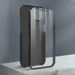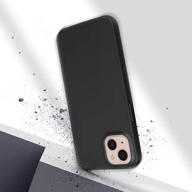 Crn ovitek za iPhone 13. Ta vsestranska 360-stopinjska zašcita ima trdo zadnjo stran iz polikarbonata, odporno na udarce, in nezlomljivo sprednjo stran iz polimera, ki pokriva zaslon in stran telefona.