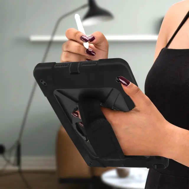 Ovitek z visoko stopnjo zašcite Apple iPad 9 2021, iPad 8 2020 in iPad 7 2019 z vrtljivim rocajem in stojalom - crn