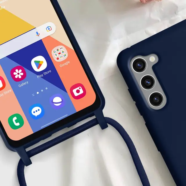 Ovitek s kablom za Samsung Galaxy S23, serija NeckShell. To ohišje iz polikarbonata in silikonskega gela šciti mobilni telefon pred udarci. Ima nastavljiv 80 cm pleten najlonski trak za nošenje telefona okoli vratu ali kot naramnico.