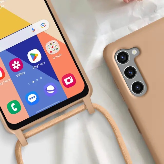Ovitek s kablom za Samsung Galaxy S23, serija NeckShell. To ohišje iz polikarbonata in silikonskega gela šciti mobilni telefon pred udarci. Ima nastavljiv 80 cm pleten najlonski trak za nošenje telefona okoli vratu ali kot naramnico.
