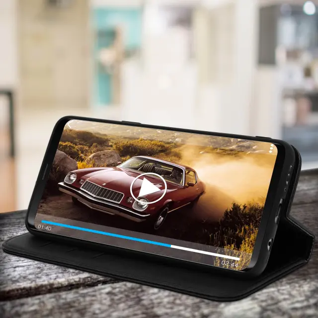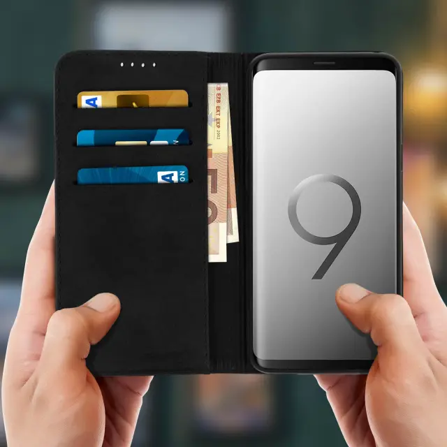 Ovitek za denarnico v videzu postaranega usnja, funkcija video podpore - crna str. Samsung Galaxy S9