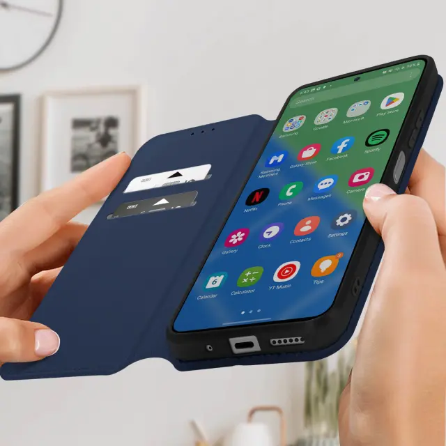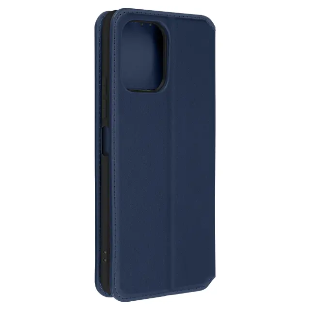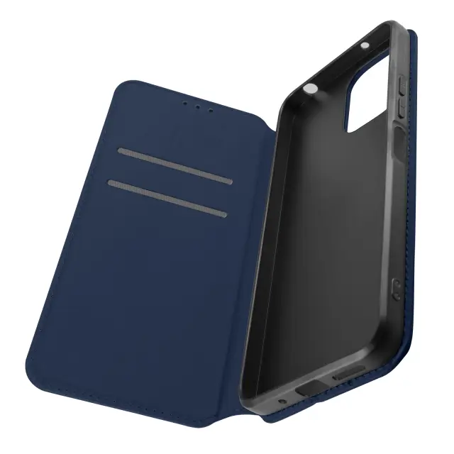 Ovitek Xiaomi Redmi 12 Folio v polnocno modri barvi. Ima predelke za kartice v podlogi magnetne lopute in odporno in prožno silikonsko gelsko lupino. Služi tudi kot vodoravna podpora za ogled vaših videoposnetkov.