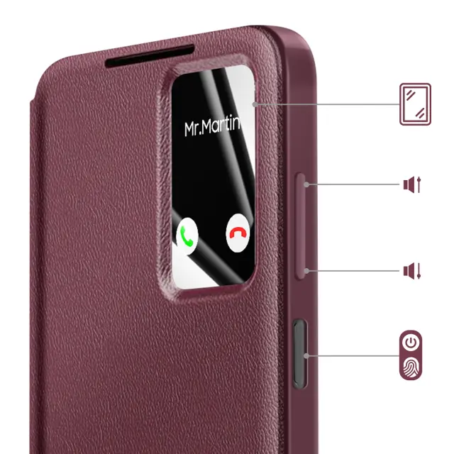 Pametno okno za pregledovanje obvestil in informacij brez odpiranja pokrova. Vgrajena sprednja in zadnja zaščita pred vsakodnevnimi udarci, praskami in padci. Vgrajeno držalo za bančne ali potovalne kartice. Nedrseča površina za varen oprijem.