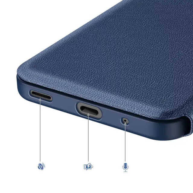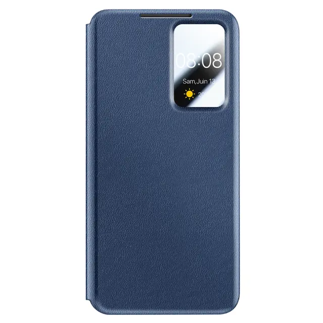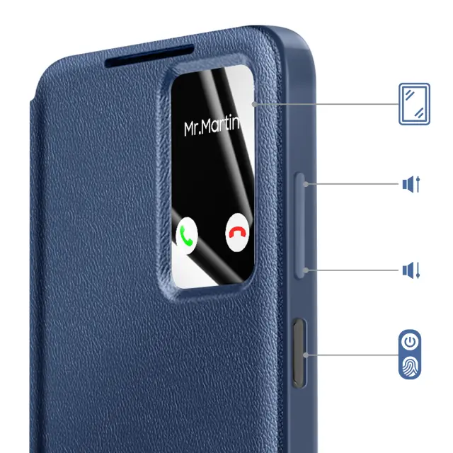 Pametno okno za pregledovanje obvestil in informacij brez odpiranja pokrova. Vgrajena sprednja in zadnja zaščita pred vsakodnevnimi udarci, praskami in padci. Vgrajeno držalo za bančne ali potovalne kartice. Nedrseča površina za varen oprijem.