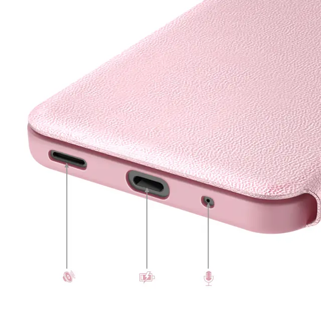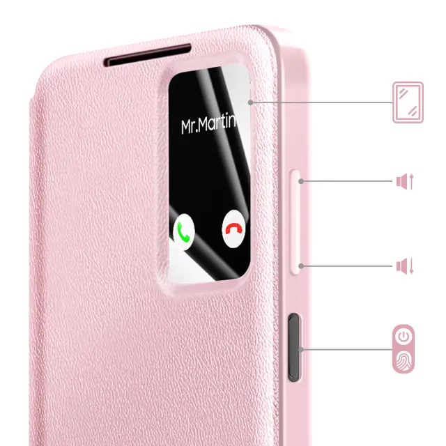 Pametno okno za pregledovanje obvestil in informacij brez odpiranja pokrova. Vgrajena sprednja in zadnja zaščita pred vsakodnevnimi udarci, praskami in padci. Vgrajeno držalo za bančne ali potovalne kartice. Nedrseča površina za varen oprijem.