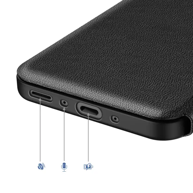 Pametno okno za pregledovanje obvestil in informacij brez odpiranja pokrova. Vgrajena sprednja in zadnja zaščita pred vsakodnevnimi udarci, praskami in padci. Vgrajeno držalo za bančne ali potovalne kartice. Nedrseča površina za varen oprijem.