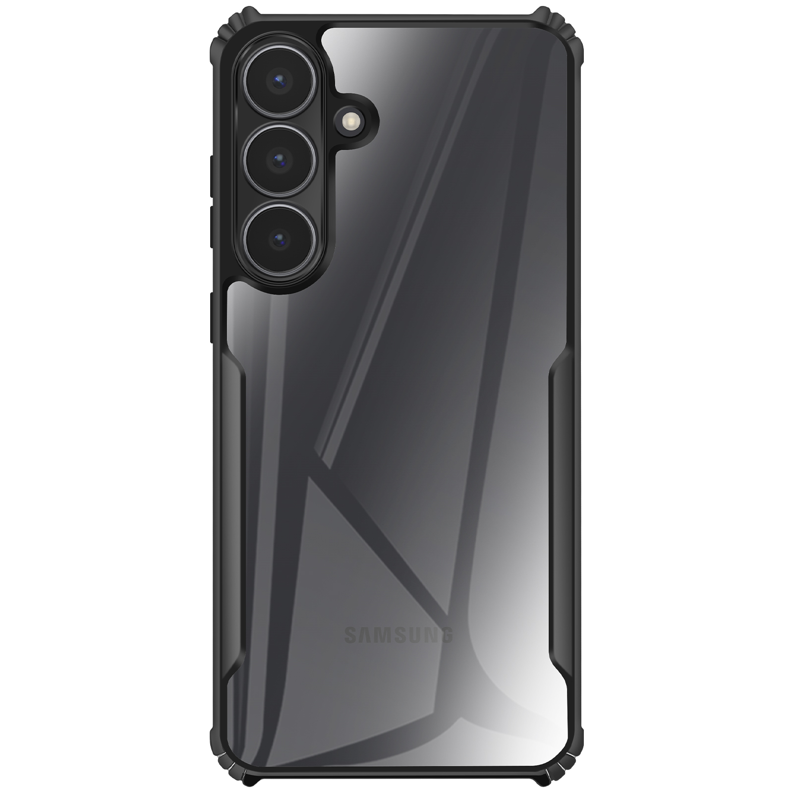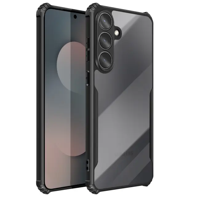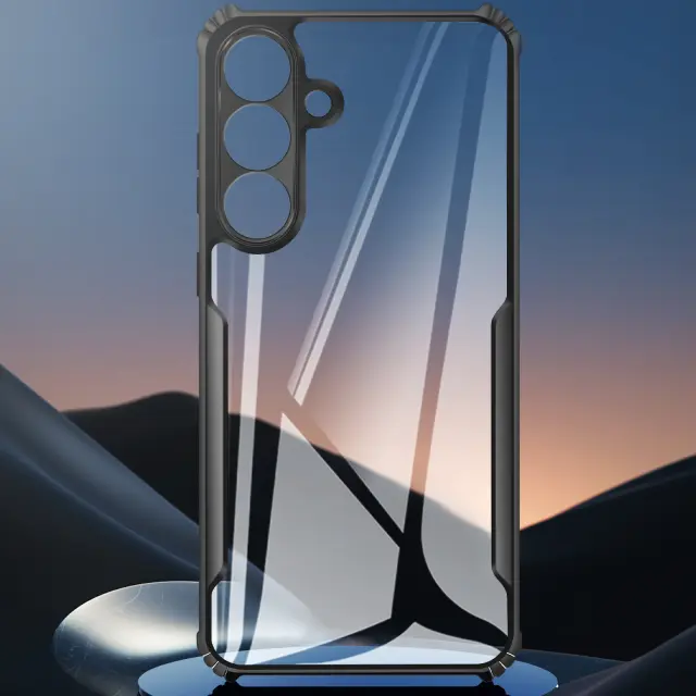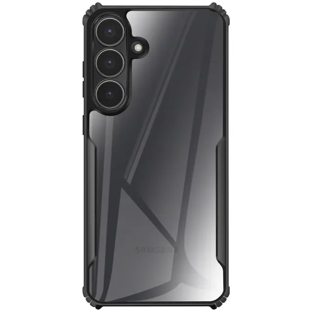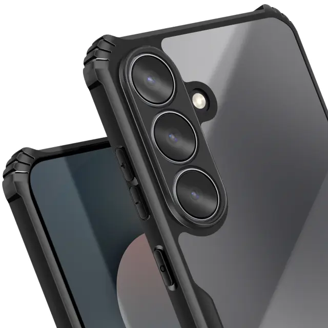 To črno ohišje za Galaxy S25 FE združuje mehko silikonsko konturo s trdo hrbtno stranjo, ki absorbira vsakodnevne udarce.. Ojačani vogali absorbirajo udarce ob padcu in ščitijo najbolj izpostavljene vogale pametnega telefona.. Kristalno čista akrilna hrbtna stran je odporna na praske in ohranja svojo prvotno prozornost, ne da bi porumenela.. Fotografska enota ima dvignjen okvir, ki ščiti leče pred drgnjenjem in neposrednimi udarci..