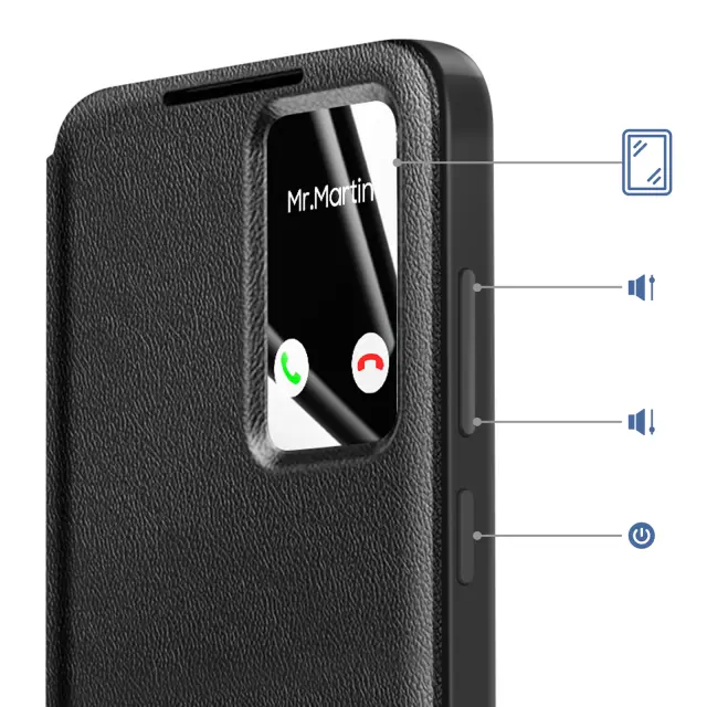 Pametno okno za pregledovanje obvestil in informacij brez odpiranja pokrova. Vgrajena sprednja in zadnja zaščita pred vsakodnevnimi udarci, praskami in padci. Vgrajeno držalo za bančne ali potovalne kartice. Nedrseča površina za varen oprijem.