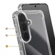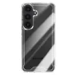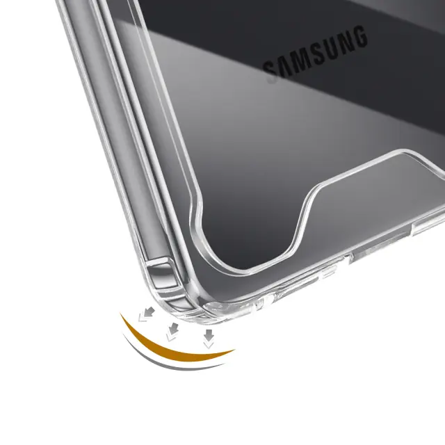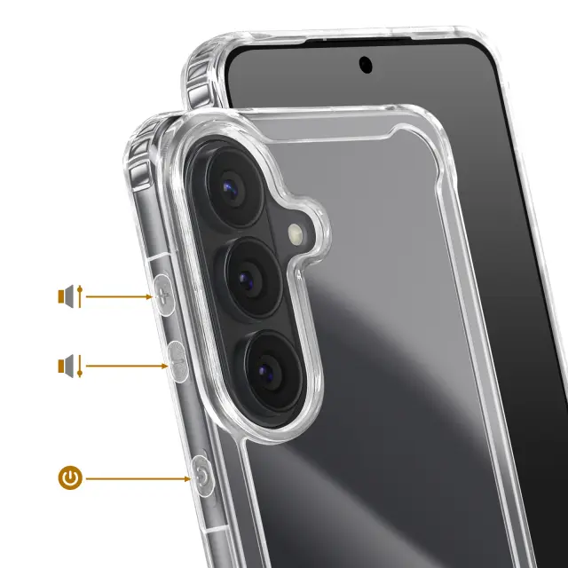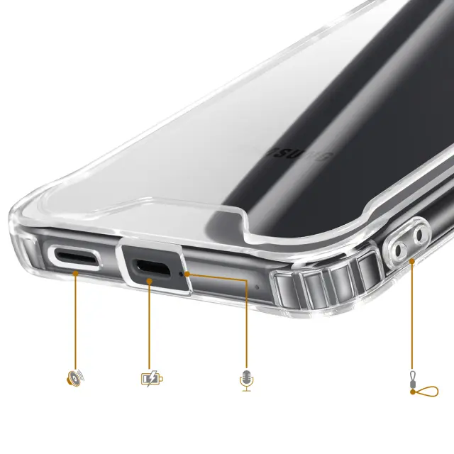 Hibridna struktura s togim hrbtiščem in mehkim silikonskim obrisom za učinkovito absorpcijo udarcev. Ojačani vogali z vgrajenimi zračnimi blazinami za zaščito pred vsakodnevnimi padci. Dvignjeni robovi ščitijo zaslon in modul kamere pred praskami in neposrednimi udarci. Jasna prozornost izboljša izvirno zasnovo telefona Galaxy S26 Plus.