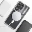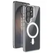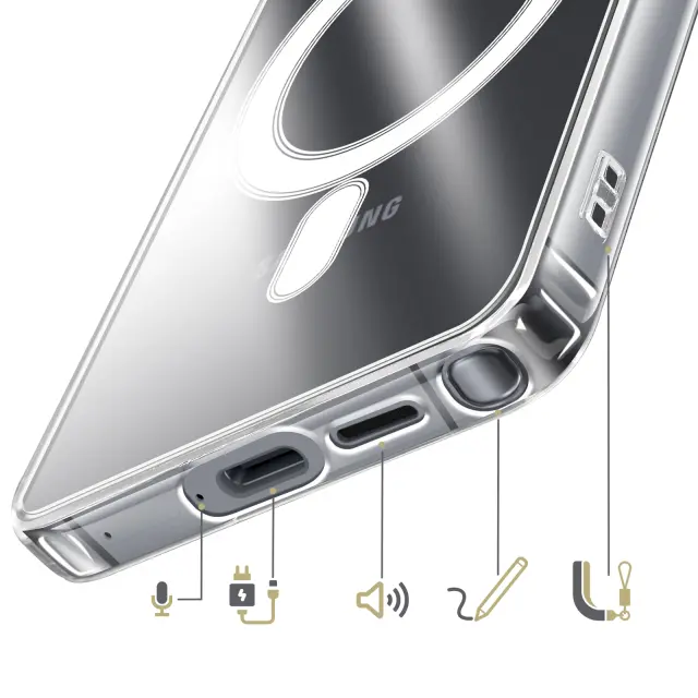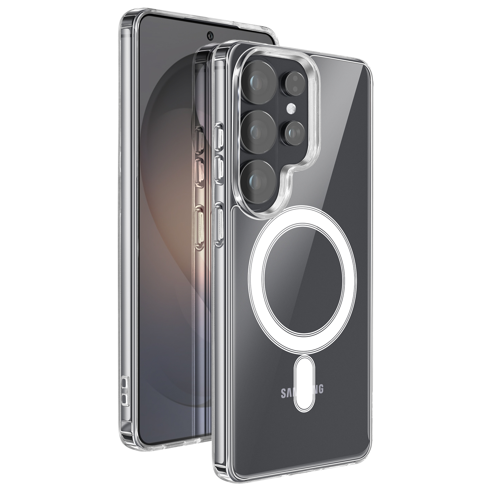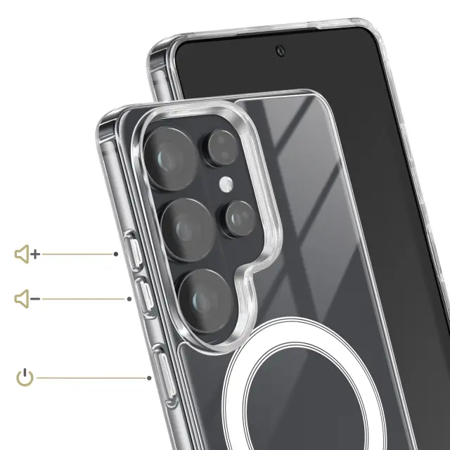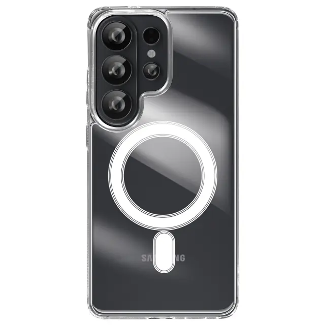 Prozorno ohišje MagSafe ščiti telefon Galaxy S26 Ultra, pri čemer je zasnova vidna. Magnetni obroč je združljiv s polnilniki MagSafe in Qi2 za stabilen in enakomeren oprijem. Zasnova iz dveh materialov: tog polikarbonatni hrbet in mehka kontura iz silikonskega gela. Zračne blazine v štirih vogalih za boljše blaženje udarcev v primeru padca.