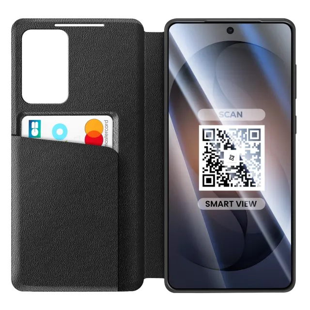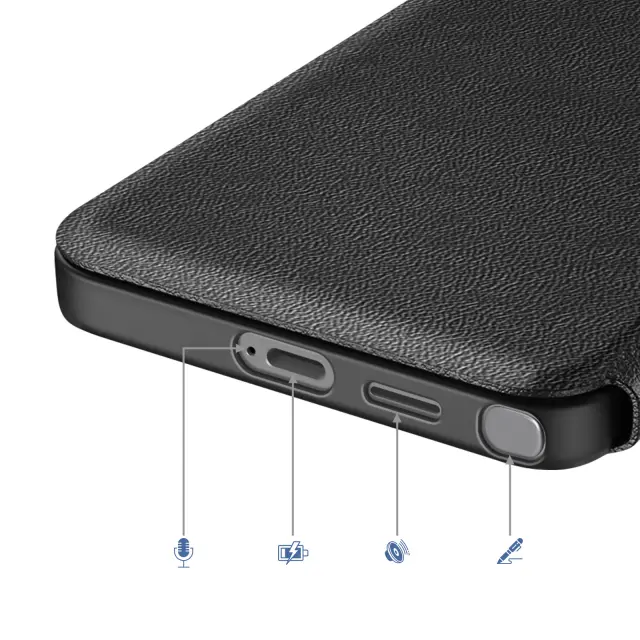 Pametno okno za pregledovanje obvestil in informacij brez odpiranja pokrova. Vgrajena sprednja in zadnja zaščita pred vsakodnevnimi udarci, praskami in padci. Vgrajeno držalo za bančne ali potovalne kartice. Nedrseča površina za varen oprijem.