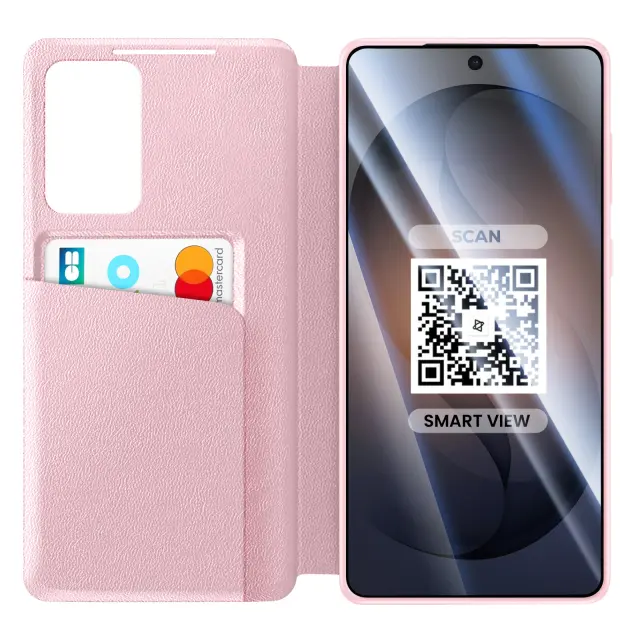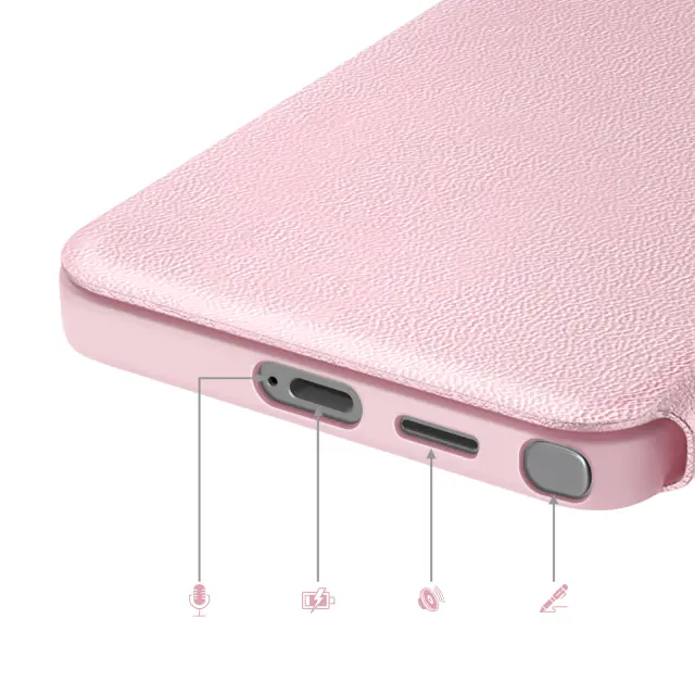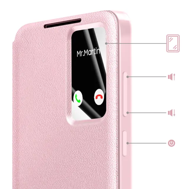 Pametno okno za pregledovanje obvestil in informacij brez odpiranja pokrova. Vgrajena sprednja in zadnja zaščita pred vsakodnevnimi udarci, praskami in padci. Vgrajeno držalo za bančne ali potovalne kartice. Nedrseča površina za varen oprijem.