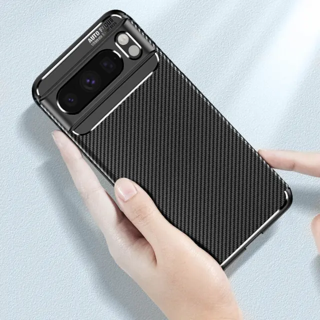 Ovitek serije Google Pixel 8 Pro Classic Carb. Zašcita za Pixel 8 Pro iz crnega silikonskega gela, odporna na udarce in praske. Karbonsko ohišje Google Pixel z dvignjenimi robovi kamere in zaslona. Njegova tekstura z ucinkom ogljikovih vlaken ponuja eleganten in eleganten dizajn.