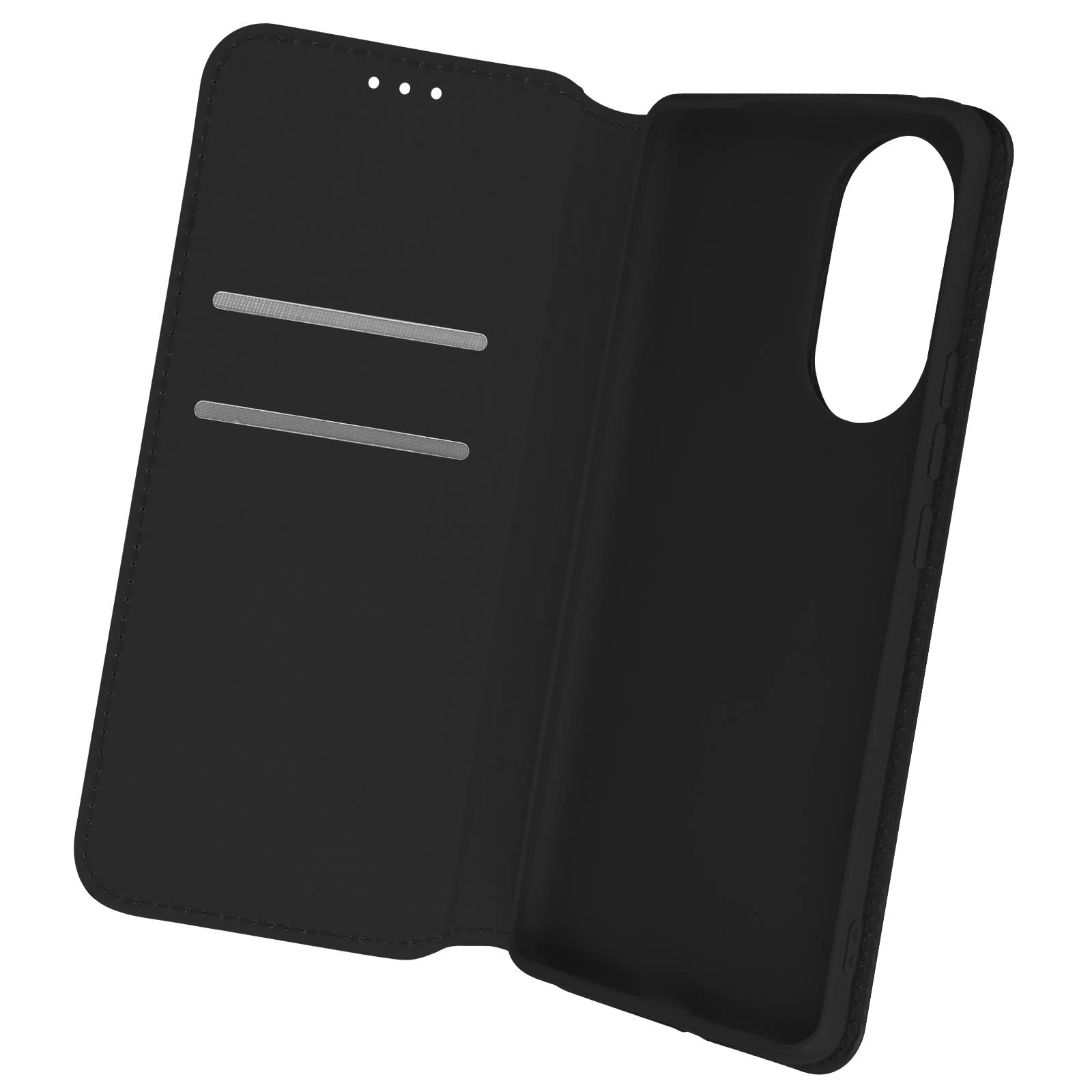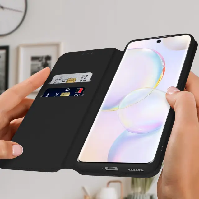 Ovitek Huawei Nova 9 in Honor 50 crn. Ta etui ima reže za kartice v preklopni podlogi in trdno, prožno silikonsko gelno ohišje. Deluje tudi kot vodoravna podpora za ogled vaših videoposnetkov.