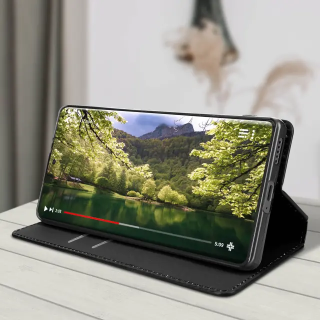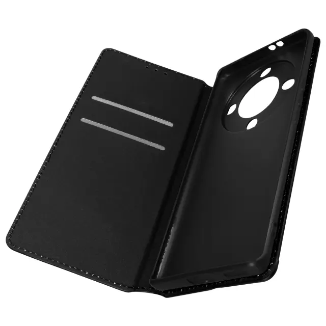 Ovitek za Honor Magic 5 Lite 5G crn. Ta etui ima reže za kartice v preklopni podlogi in trdno, prožno silikonsko gelno ohišje. Deluje tudi kot vodoravna podpora za ogled vaših videoposnetkov.