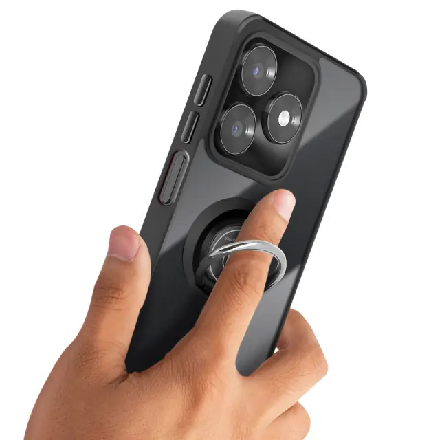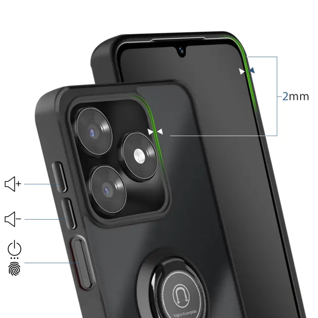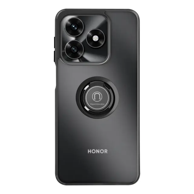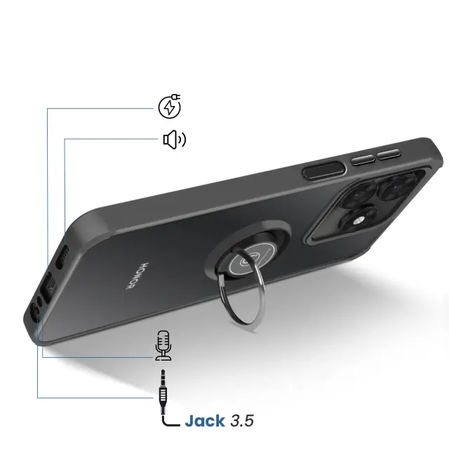 To ohišje za telefon Honor X5c Plus 4G ima trdno hrbtno stran iz matiranega polikarbonata z mat površino, ki je odporna na praske in sledi.. Mehak črn okvir TPU po vsej dolžini obdaja vogale in pomaga absorbirati blage udarce v vsakdanjem življenju.. Kovinski vrtljivi obroč se vrti za 360° in napravo stabilizira v vodoravnem položaju za ogled vsebine ali opravljanje video klicev.. Zaradi feromagnetnega vložka v obroču je lupina združljiva z magnetnimi nosilci za avtomobile..