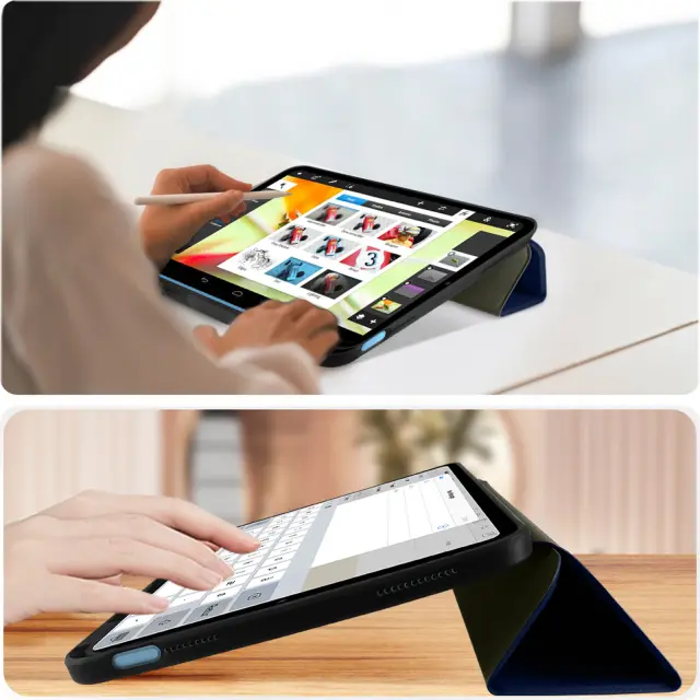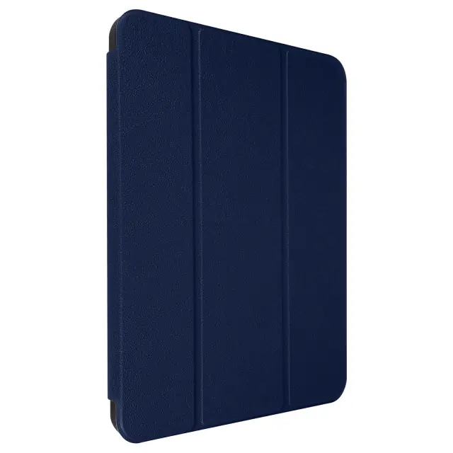 Polnocno modra torbica za iPad 10 2022. Ima dve podporni funkciji iz dveh zornih kotov za gledanje videoposnetkov in uporabo tipkovnice. Ta etui ima na dotik mehko notranjost, ki šciti vaš tablicni racunalnik pred praskami.