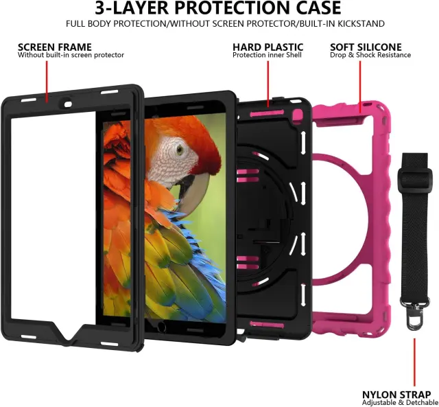 Ta visokokakovosten ovitni ovitek je zasnovan za zagotavljanje celovite zaščite vaše naprave med vsakodnevno uporabo. Njegova napredna sestava vključuje tri plasti, ki združujejo trdno plastično ohišje in mehko silikonsko hrbtišče za ublažitev vibracij. Ovitek je idealen pripomoček za tiste, ki svojo napravo uporabljajo v dinamičnih okoljih, saj omogoča varno uporabo v različnih situacijah. Natančno izdelani izrezi zagotavljajo neoviran dostop do vseh gumbov in vrat, kar omogoča nemoteno delovanje vseh funkcij tabličnega računalnika.