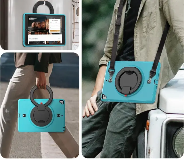 Vzdržljiv turkizen ovitek predstavlja odlično rešitev za vse uporabnike, ki potrebujejo kombinacijo brezkompromisne zaščite in praktične funkcionalnosti. Njegova premišljena zasnova z ergonomskim ročajem in naramnim trakom zagotavlja varnost in udobje pri uporabi v vseh okoljih. Izberite ta ovitek za vašo napravo in si zagotovite brezskrbno uporabo s sodobnim videzom še danes.