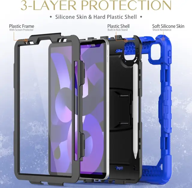 Ta visokokakovosten zaščitni ovitek je zasnovan za zagotavljanje celovite varnosti vaše naprave med vsakodnevno uporabo. Njegova napredna trislojna sestava vključuje togo plastično ohišje PC in mehko silikonsko hrbtišče, kar učinkovito ščiti tablico pred praskami, močnimi udarci in neželenimi vibracijami. Izdelek je posebej primeren za uporabo na prostem, saj vključuje praktično stojalo in naramni trak, ki omogočata udobno upravljanje naprave med različnimi dejavnostmi, kot so izleti ali pohodništvo. Natančno izdelani izrezi zagotavljajo, da so vsi gumbi in vrata vedno dostopni, hkrati pa integrirano držalo za pisalo poskrbi za urejeno shranjevanje vaših dodatkov.