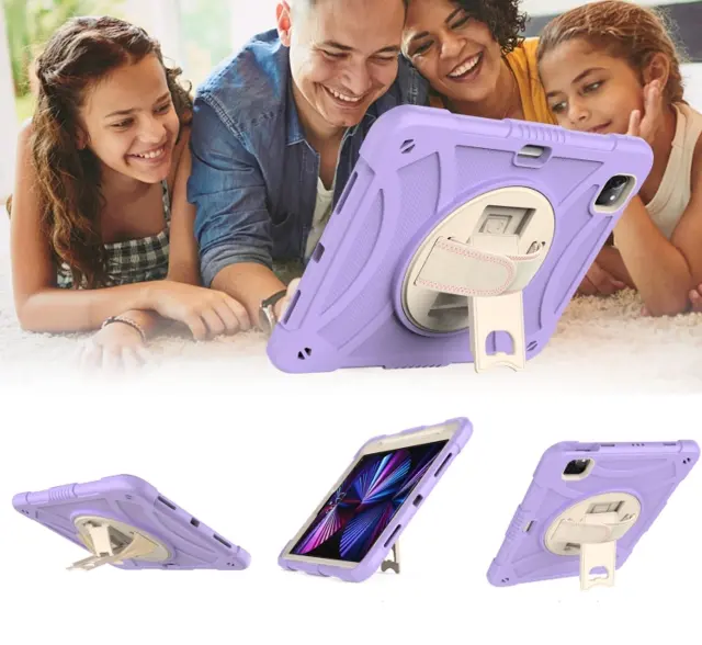 Ta ovitni ovitek je zasnovan za zagotavljanje najvišje ravni zaščite za vašo tablično napravo med vsakodnevno uporabo. Sestavljen je iz treh plasti, ki vključujejo plastično ohišje iz PC in mehko silikonsko hrbtišče za učinkovito ublažitev prask, udarcev ter vibracij. Izdelek vključuje vgrajeno zložljivo stojalo z možnostjo vrtenja za 360 stopinj, kar omogoča prilagodljive kote uporabe in večje udobje pri delu ali zabavi. Dodatno opremo dopolnjuje nastavljiv in snemljiv naramni pas, ki omogoča varno prenašanje naprave med dejavnostmi na prostem, kot so pohodništvo in izleti.