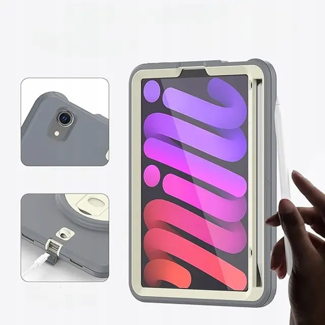 Ta visokokakovosten zaščitni ovitek je zasnovan za napravo iPad Mini 6 z diagonalo zaslona 8,3 palca in nudi celovito varnost pri vsakodnevni uporabi. Njegova napredna sestava vključuje tri različne plasti, ki združujejo trdno plastično ohišje PC in prilagodljivo silikonsko hrbtišče za ublažitev zunanjih sil. Pripomoček je idealen za različna okolja, od profesionalnih pisarniških prostorov do domače uporabe, kjer učinkovito ščiti tablico pred neželenimi praskami, močnejšimi udarci in vibracijami. Zasnova omogoča stabilno namestitev naprave v različnih položajih, kar znatno izboljša ergonomijo pri delu ali zabavi.