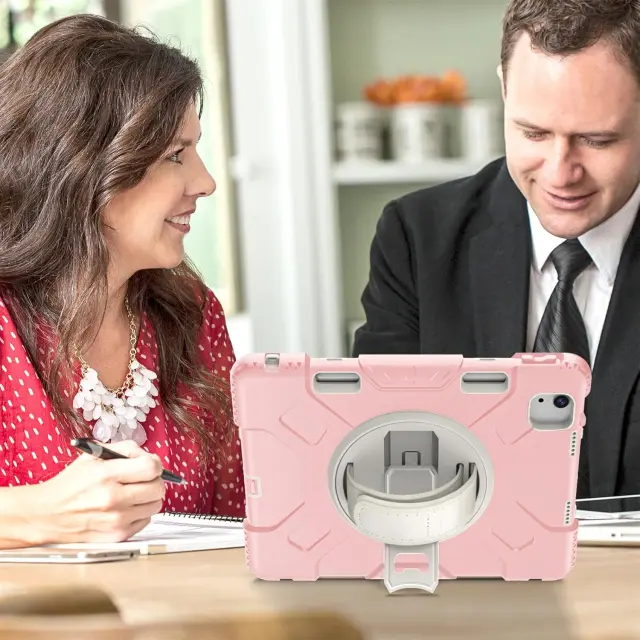 Ta ovitni ovitek je zasnovan za zagotavljanje vsestranske zaščite vaše naprave med vsakodnevno uporabo v različnih okoljih. Njegova sestava vključuje trdno plastično ohišje in mehak silikonski hrbtni del, kar skupaj tvori učinkovit ščit pred neželenimi mehanskimi poškodbami. Izdelek je primeren za širok nabor uporabnikov, od profesionalcev na konferencah do otrok doma, saj omogoča varno rokovanje v vseh situacijah. Z vgrajenimi praktičnimi elementi, kot je vrtljivo stojalo, močno olajša dolgotrajno uporabo tablice brez nepotrebne obremenitve rok.