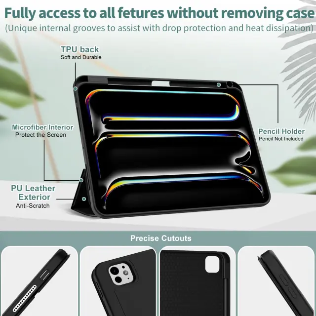 Ovitek Sonlaryin je namensko zasnovan za zaščito in izboljšano funkcionalnost tabličnega računalnika iPad Pro 11-palčni pete generacije z oznako M4. Izdelek je izdelan iz trpežne kombinacije zunanje plasti iz umetnega usnja, notranje podloge iz mikrovlaken in upogljivega zadnjega dela iz TPU materiala, kar zagotavlja celovito zaščito pred vsakodnevnimi poškodbami. Njegova lahka in tanka oblika omogoča enostavno prenašanje v torbi ali nahrbtniku, zato je primeren tako za poslovno uporabo kot za potovanja. Z vgrajenimi funkcijami, kot sta pametno prebujanje naprave in namensko držalo za elektronsko pisalo, predstavlja praktičen dodatek za vsakega uporabnika.