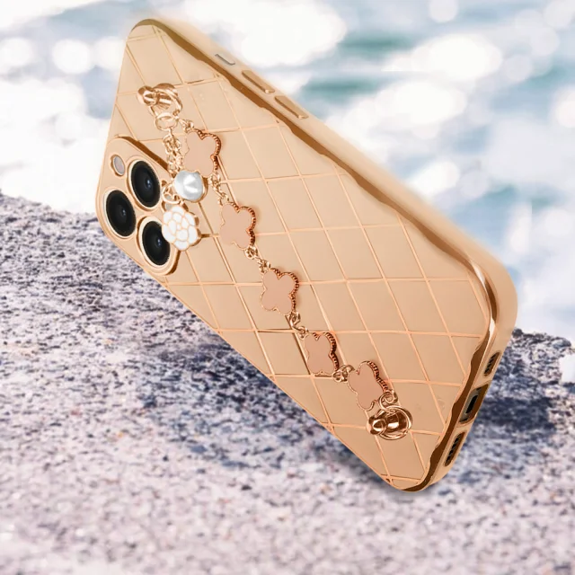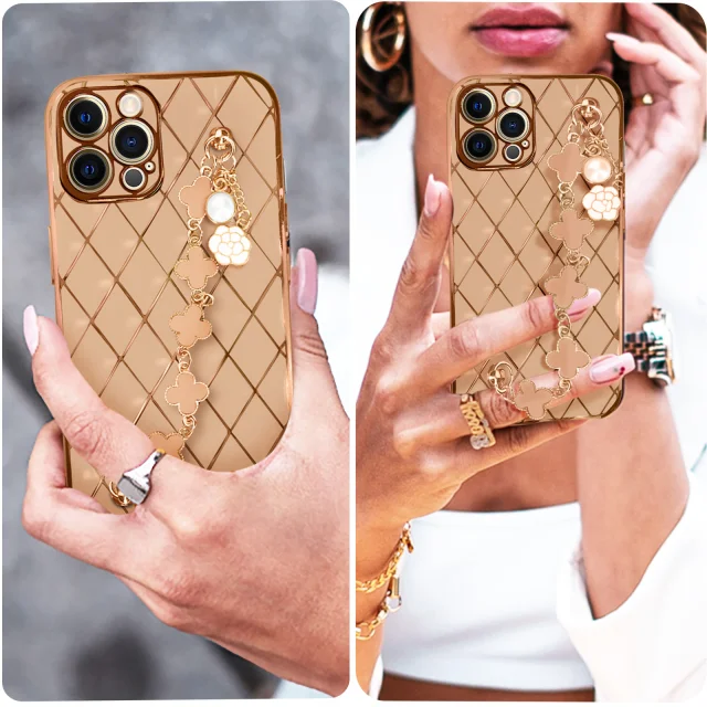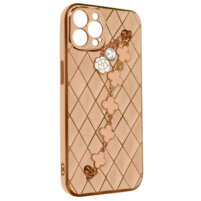 Ovitek za iPhone 12 Pro z geometrijskim vzorcem in verižico iz štiriperesne deteljice - roza