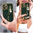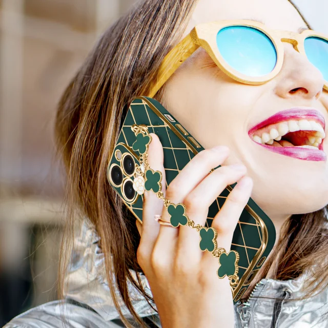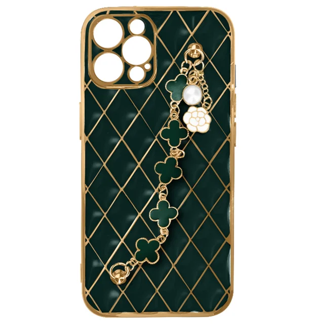 Ovitek za iPhone 12 Pro z geometrijskim vzorcem in verižico iz štiriperesne deteljice - zelen