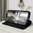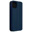 Polnocno moder ovitek za iPhone 13. Ta etui ima predelke za shranjevanje kartic v preklopni podlogi in trdno, prožno silikonsko gelno ohišje. Deluje tudi kot vodoravna podpora za ogled vaših videoposnetkov.
