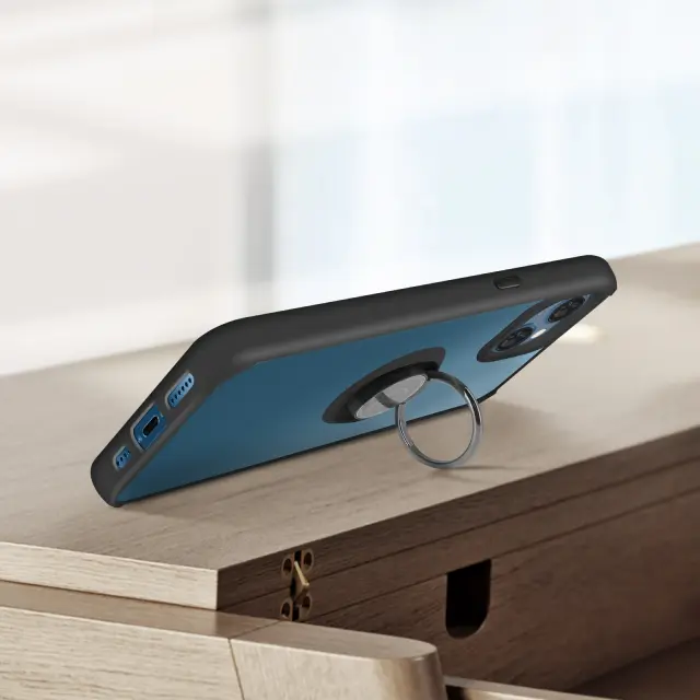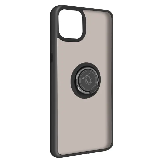 Zaščitna torbica z obročkom posebej oblikovana za Apple iPhone 13 Mini - črna. Integriran zadrževalni obroč na zadnji strani zaščite za varno uporabo. Navpična ali vodoravna podpora z obročem na zadnji strani ohišja. Ojačani silikonski robovi in vogali za blaženje udarcev.