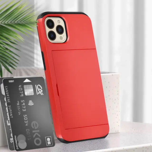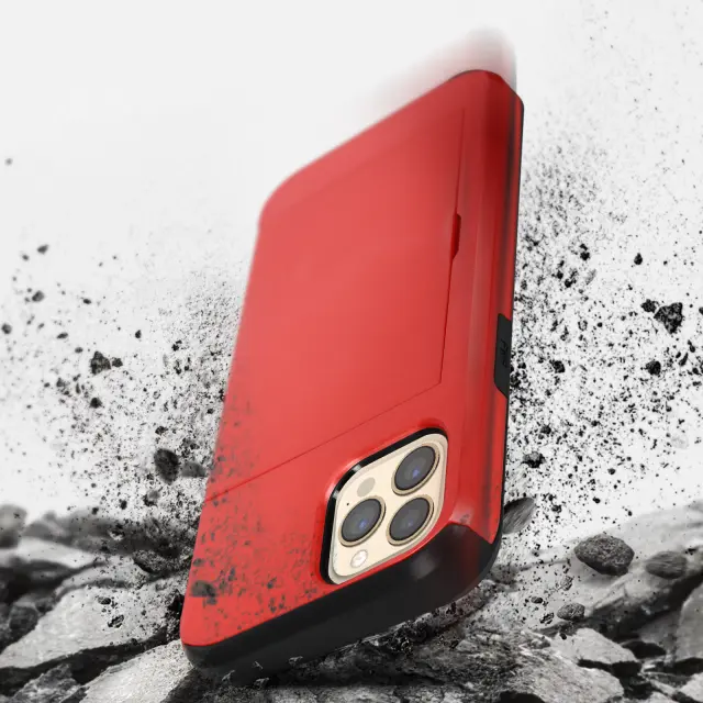 Rdec etui iz dveh materialov za iPhone 13 Pro, serija Defender. Šciti vaš iPhone 13 Pro, hkrati pa ga odene z eleganco. Zelo prakticen z držalom za kartice z drsno odprtino na zadnji strani. Pusti vse funkcije dostopne.