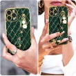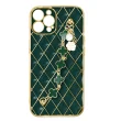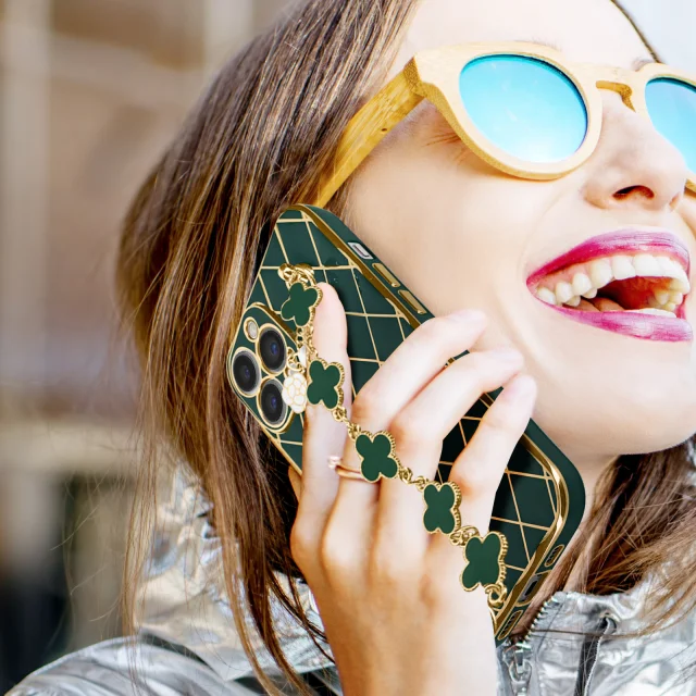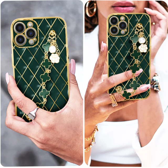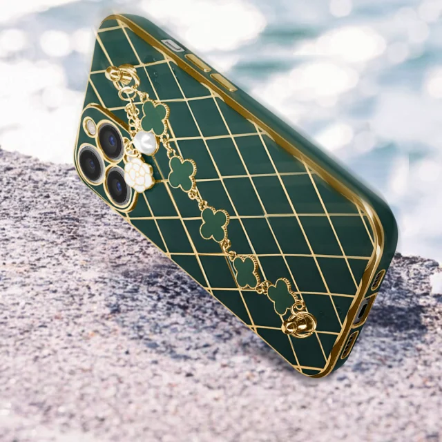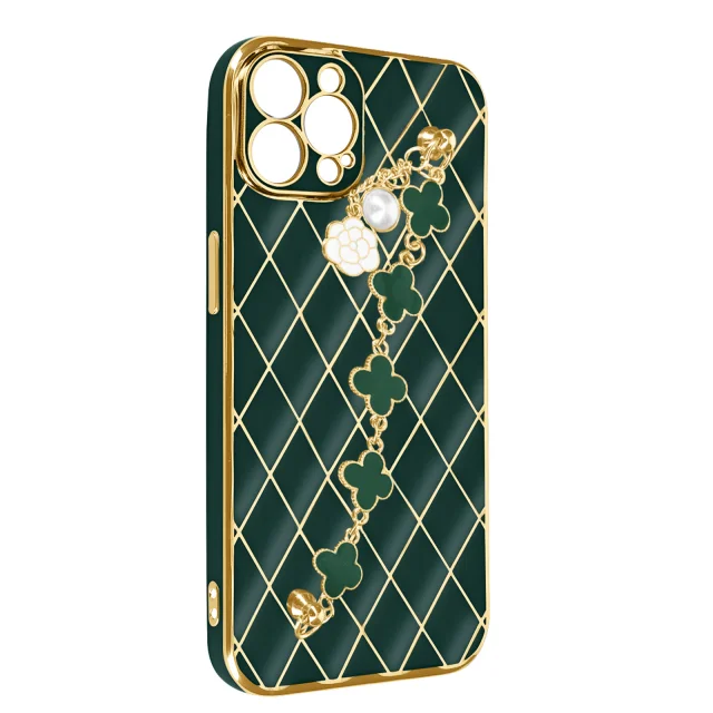 Ovitek za iPhone 13 Pro z geometrijskim vzorcem in verižico iz štiriperesne deteljice - zelen