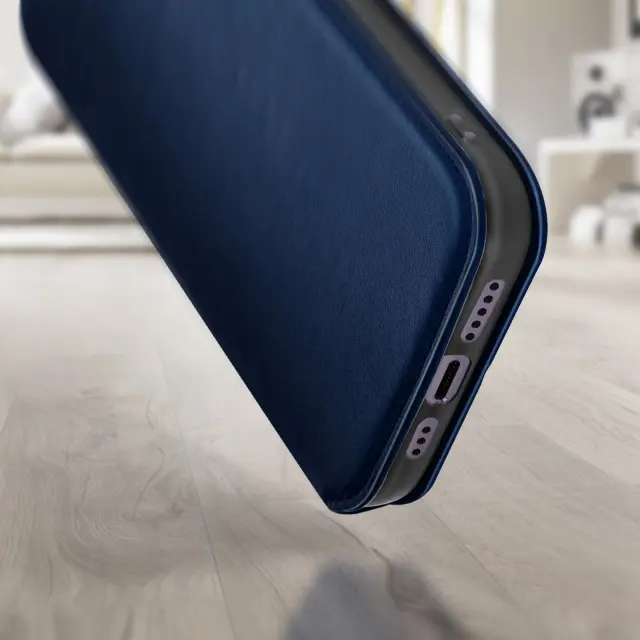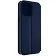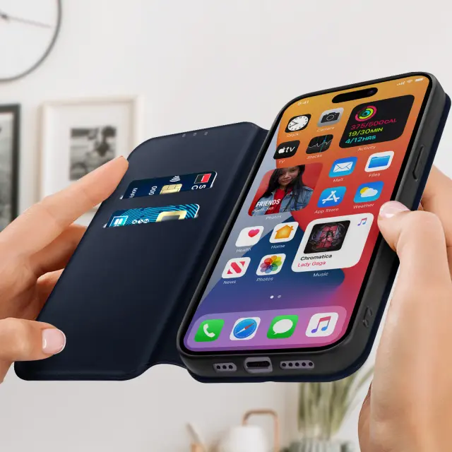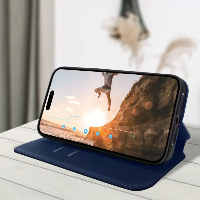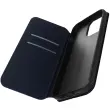 Polnocno modra torbica za iPhone 14 Pro Max. Ta etui ima reže za kartice v preklopni podlogi in trdno, prožno silikonsko gelno ohišje. Deluje tudi kot vodoravna podpora za ogled vaših videoposnetkov.