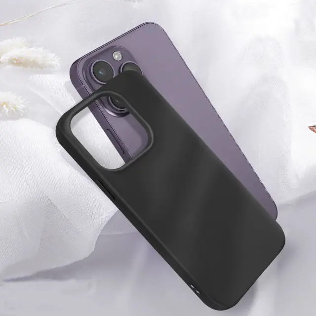 Črna zaščitna torbica, zasnovana za vaš iPhone 14 Pro Max. Zasnova z mat efektom za eleganten in preprost dizajn. Izdelan iz prožnega, odpornega silikona. Mat zaključek za preprosto in elegantno obliko.