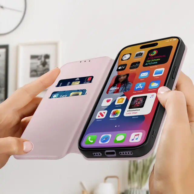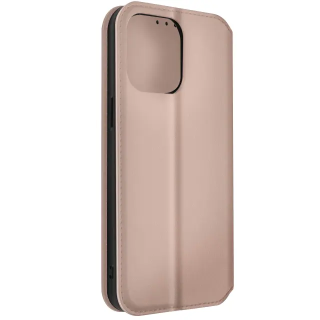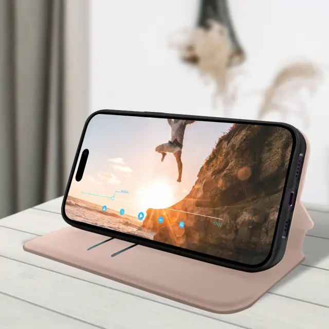 Ovitek za iPhone 14 Pro v barvi šampanjca. Ta etui ima reže za kartice v preklopni podlogi in trdno, prožno silikonsko gelno ohišje. Deluje tudi kot vodoravna podpora za ogled vaših videoposnetkov.