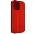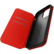 Rdeca torbica za iPhone 14 Pro. Ta etui ima reže za kartice v preklopni podlogi in trdno, prožno silikonsko gelno ohišje. Deluje tudi kot vodoravna podpora za ogled vaših videoposnetkov.