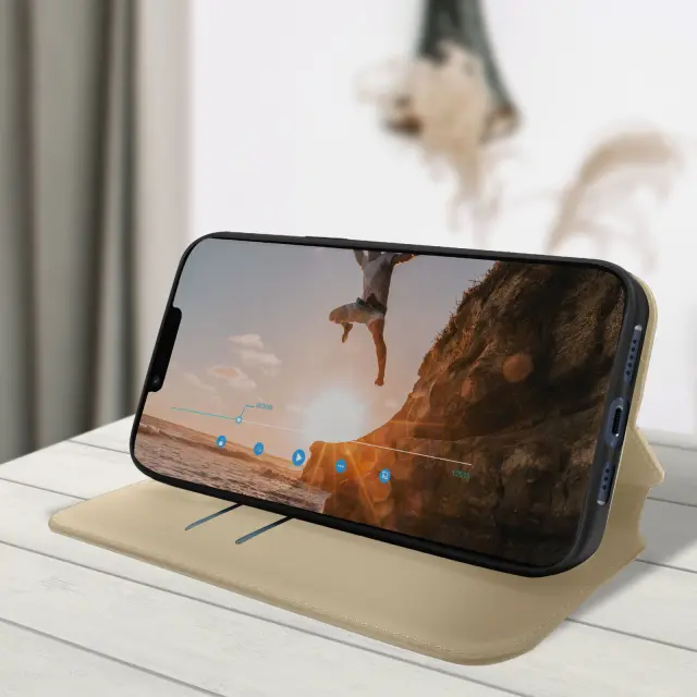 Ovitek za iPhone 14 z magnetnim preklopom, držalom za kartico in video držalom - zlata