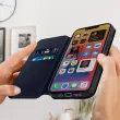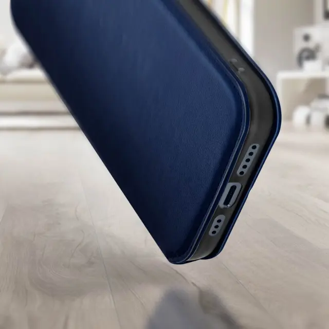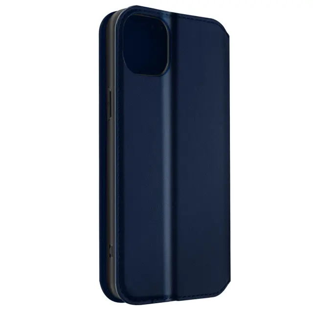 Polnocno modra torbica za iPhone 14. Ta etui ima reže za kartice v preklopni podlogi in trdno, prožno silikonsko gelno ohišje. Deluje tudi kot vodoravna podpora za ogled vaših videoposnetkov.
